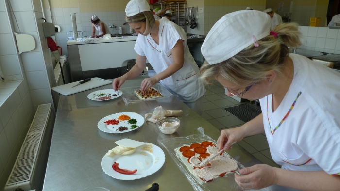 Již mnohokrát jsme informovali veřejnost o tom, že se na SOU a SOŠ SČMSD nevzdělávají pouze absolventi základních škol. Tuto možnost jsme před několika lety dali i jejich rodičům, příbuzným, známým a vůbec všem dospělým, kteří mají chuť nebo potřebu se dále vzdělávat. Zájemci mohli a nadále mohou využít dálkové studium, doplňkové kurzy a nejaktuálněji také vzdělávání v rámci projektů UNIV 2 KRAJE a UNIV 3. 15. června 2013 se ve školní restauraci konala závěrečná zkouška pilotního ověřování profesní kvalifikace Příprava pokrmů studené kuchyně. Ze 14 přihlášených uchazeček ze znojemských a třebíčských školních jídelen jich ve „finále“ 12 připravilo ukázku výrobků studené kuchyně, které spolu s nimi viděli a ochutnali i jejich rodinní příslušníci. Všechny uchazečky se na zkoušku těšily, i když u mnohých z nich byla tréma velmi patrná. Po zahájení zkoušky však nebylo po nervozitě a stresu ani památky a ani si žádná z přítomných „studentek“ neuvědomovala, že za jejich zády stojí i „kontrola“ z NUV (Národní ústav vzdělávání) Mgr. Petr Paníček. Po celý den vládla v kuchyni přátelská atmosféra a na tvářích všech dam byla vidět radost z toho, že se po několik letech vrátily do školy. Po ukončení zkoušky následovalo předávání certifikátů o úspěšném absolvování vzdělávacího programu a pak už si absolventky i hodnotitelé mohli v klidu popovídat o svých zkušenostech a zážitcích z dalšího vzdělávání a při tom i ochutnat výrobky studené kuchyně.