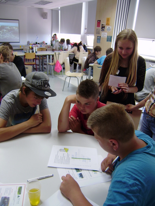 Vyplnění křížovky a odhalení tajenky – odpovědi křížovky vycházely nejen z úvodní prezentace o odpadech, kterou měli žáci ZŠ k dispozici i v tištěné podobě, ale i z informací poskytnutých studenty SOŠ, které doplňovaly danou prezentaci. Tento úkol tedy prověřil pozornost žáků ZŠ při výkladu prezentace, jejich vlastní znalosti a také dovednost pracovat s textem.