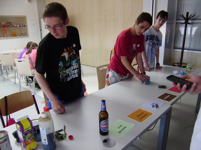 Přiřazování odpadu do správného kontejneru – žáci měli k dispozici vzorky jednotlivých odpadů a měli je správně zařadit do barevně označených kontejnerů. Úkol prověřil, zda žáci zvládají správné třídění odpadů a byl hodnocen podle rychlosti jeho splnění a správného zařazení.