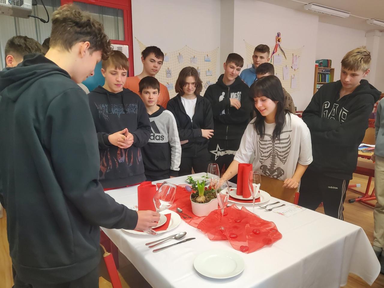 Třída 8. D: Prezentaci oboru Kuchař-číšník na téma stolování jsem si užila, byla skvělá. Určitě zkusím doma připravit v neděli tabuli. Koukala jsem, kolik je typů příborů a druhů skleniček. Bylo pro mě náročné pochopit, kam se na stůl co dává. Prostřený stůl vypadal moc hezky. Je super, že škola spolupracuje s různými restauracemi a kavárnami.